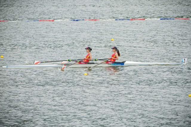 9月20日,中国组合邹佳琪(右)、邱秀萍在女子轻量级双人双桨预赛中。她们以6分52秒43的成绩晋级决赛。新华社记者 江汉 摄