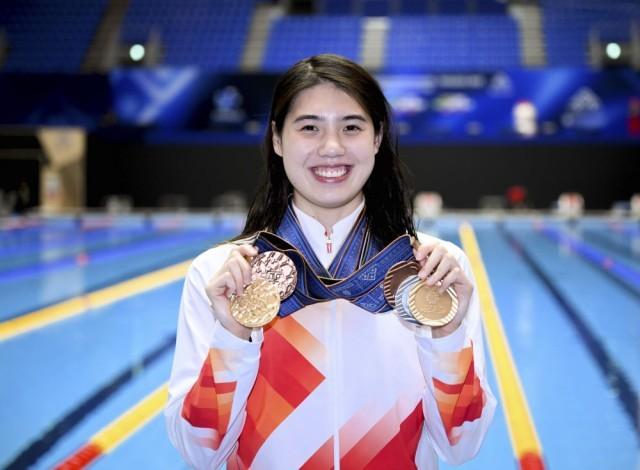 资料图:张雨霏与奖牌合影。新华社记者 夏一方 摄