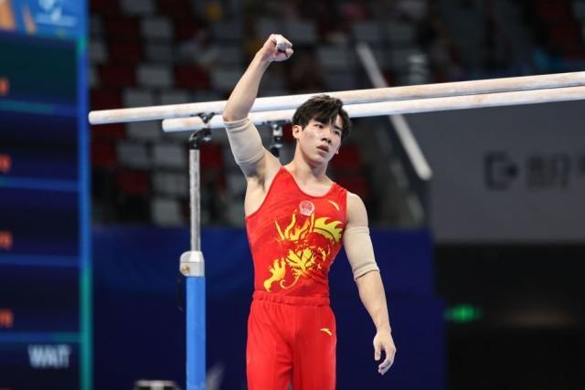 8月4日,中国选手张博恒在双杠比赛后向观众致意。当日,在成都举行的第31届世界大学生夏季运动会体操项目男子个人全能决赛中,中国选手张博恒以86.733分的总成绩获得冠军。新华社记者 张丽芸 摄