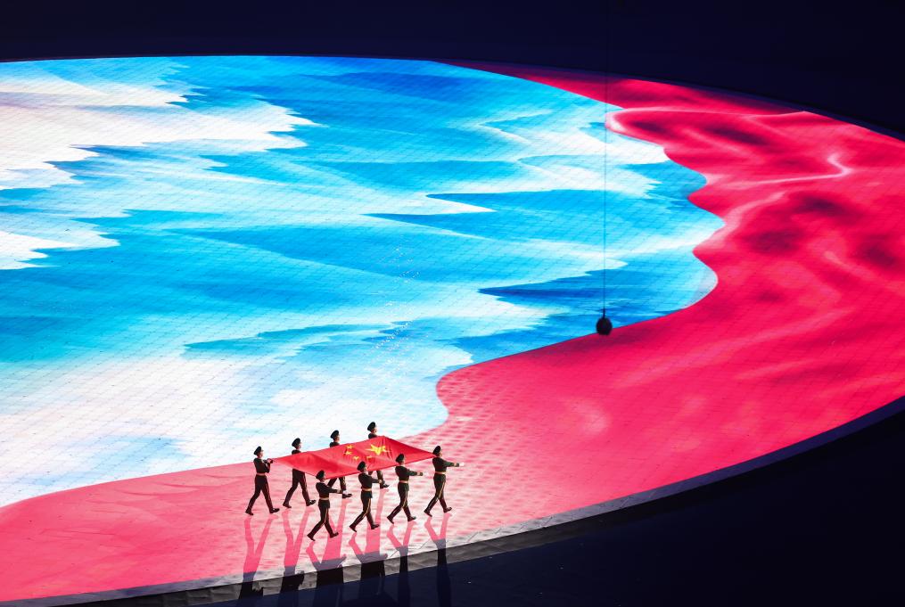 地屏上,一幅红绸飞掠壮丽河山。8名仪仗兵步伐铿锵,护旗入场。“我爱你中国,我爱你春天蓬勃的秧苗……”动人的赞歌深情唱响。