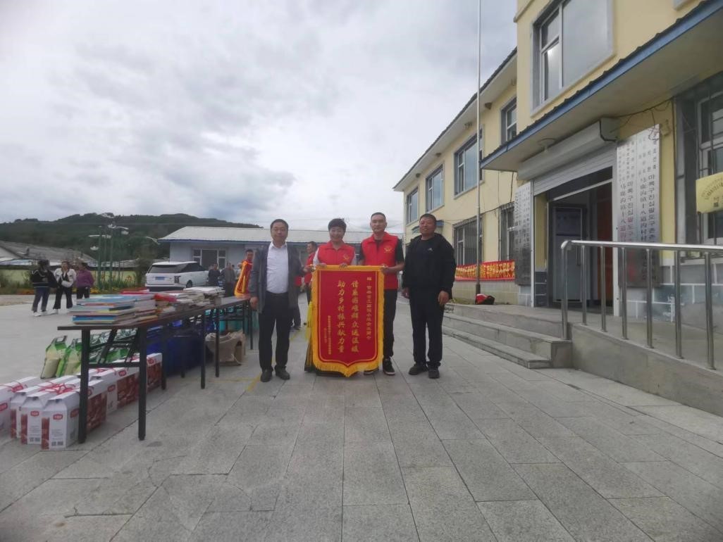 吉林省委宣传部派驻十八道沟村第一书记赵长江、村党支部书记陈军代表向爱心企业赠送“情系困难群众送温暖 助力乡村振兴献力量”的锦旗,感谢企业的真心帮扶、爱心奉献。