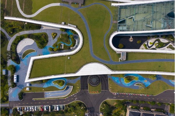 8月24日,空中俯瞰杭州富阳水上运动中心,屋顶被绿植覆盖(无人机照片)。新华社记者 徐昱 摄