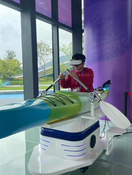 场馆专门设立VR赛艇体验区,观众们在观看了激烈、热血的水上项目比赛后也能过把瘾。该项目根据富阳水上运动中心环境定制游戏内容,可以选择多种模式进行体验。通过船桨内置无线动作追踪传感器以及VR头盔中对不同场景的模拟,能1:1还原赛道和水流感。
