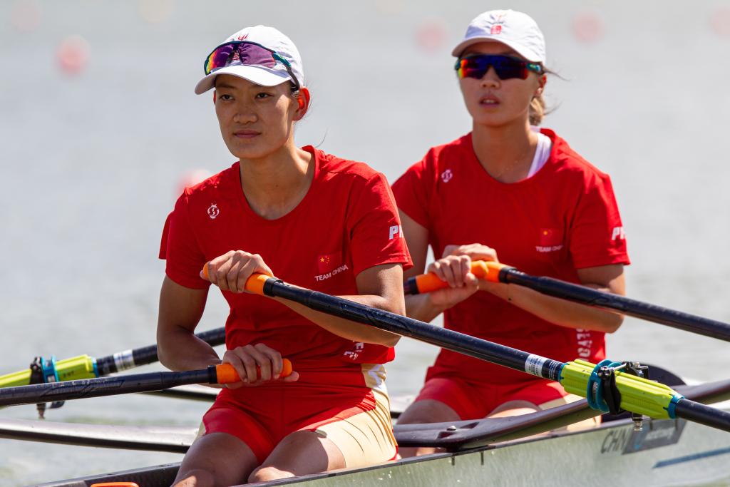 2022年6月17日,中国选手邱秀萍、邹佳琪(右)在2022年赛艇世界杯波兰波兹南站轻量级女子双人双桨预赛中。新华社发(亚斯科乌卡摄)