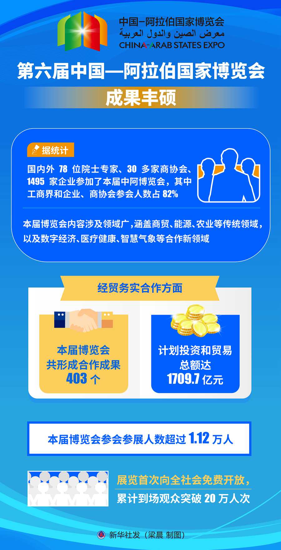 新华社银川9月24日电(记者靳赫、郑一晗)记者24日从第六届中国—阿拉伯国家博览会成果发布会上获悉,为期4天的博览会成果丰硕,参会参展人数创新高,经贸务实合作深入推进。