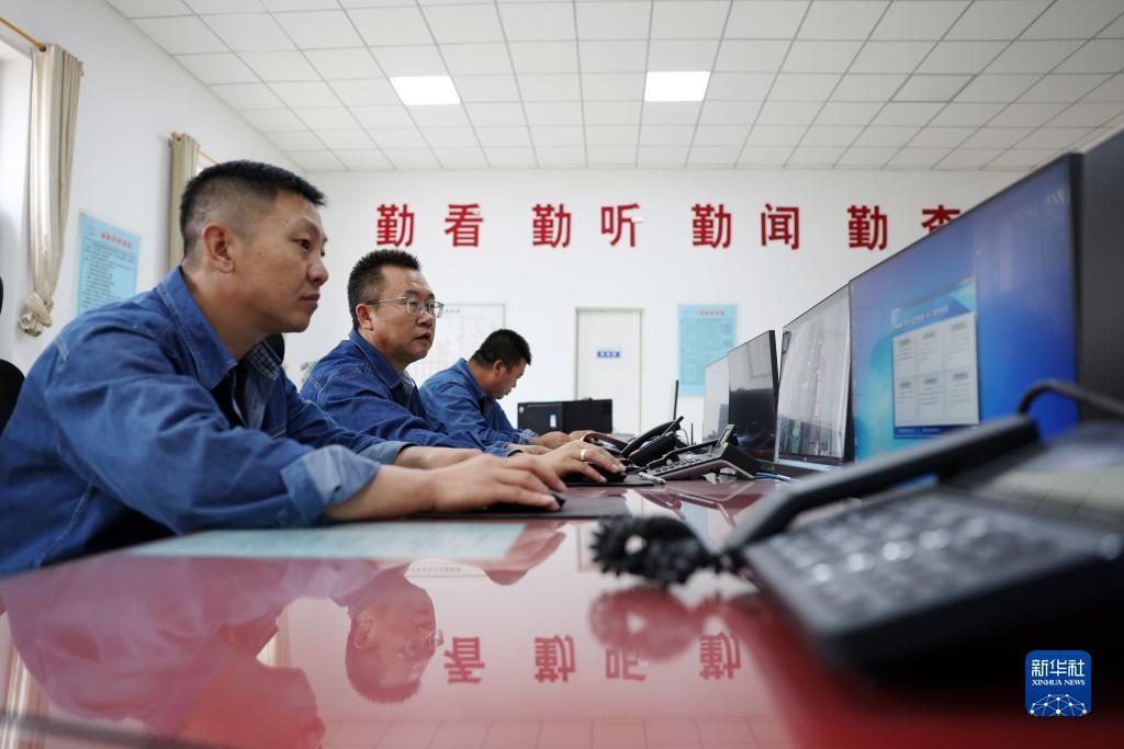 宁夏红寺堡扬水管理处红三泵站副站长赵金柱(中)在中控室与同事监控各项数据(9月7日摄)。