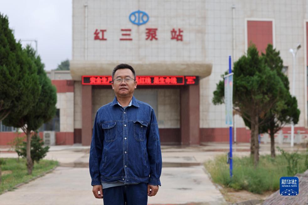 宁夏红寺堡扬水管理处红三泵站副站长赵金柱在泵站机房前留影(9月7日摄)。