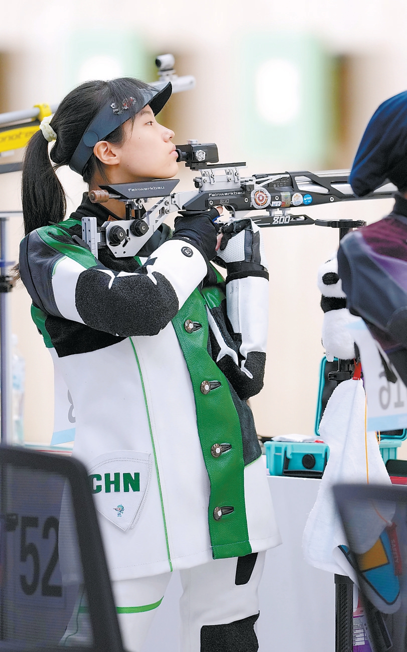 昨天,在女子10米气步枪团体赛中,由韩佳予、黄雨婷、王芝琳组成的中国队夺得金牌。图为王芝琳在比赛中。北京日报记者 李继辉摄