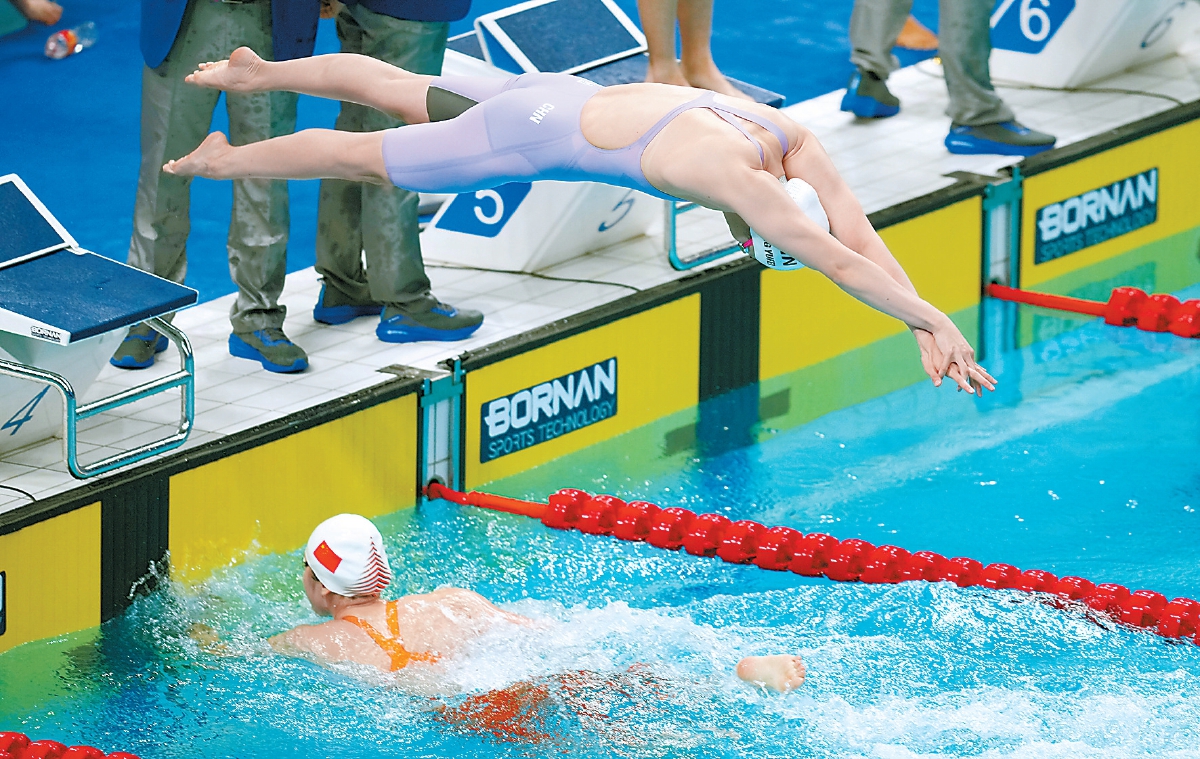 昨晚进行的女子4×100米自由泳接力决赛中,由杨浚瑄、程玉洁、吴卿风和张雨霏组成的中国队以3分33秒96的成绩夺冠,并打破赛会纪录。北京日报记者 刘平摄