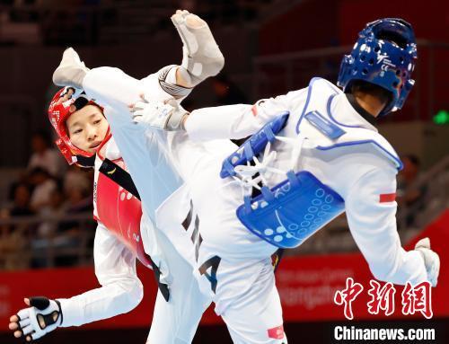 9月25日,杭州第19届亚运会跆拳道比赛在临安体育文化会展中心体育馆举行。图为中国选手郭清(红方)在女子49公斤级1/8淘汰赛中战胜印度尼西亚选手。 中新社记者 殷立勤 摄