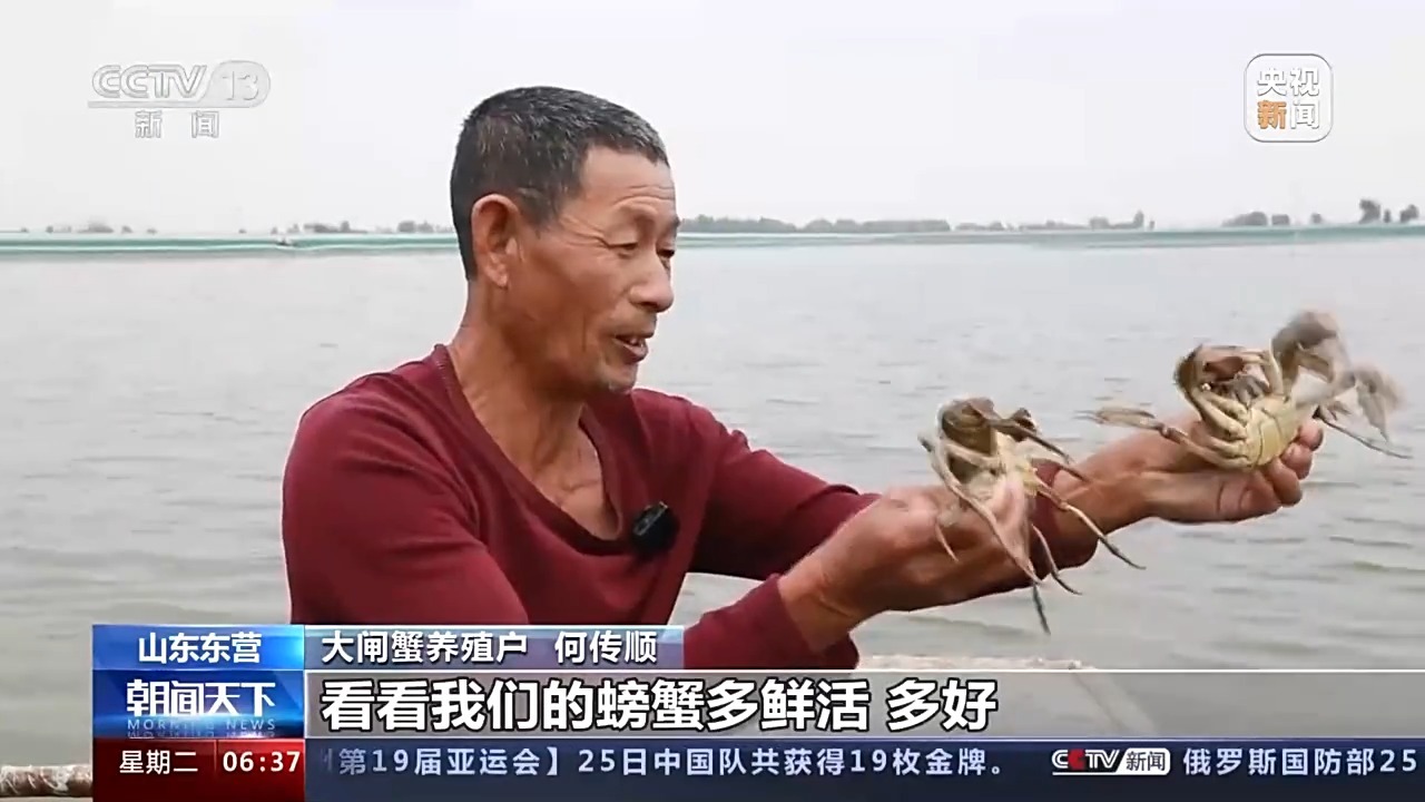 山东省东营市垦利区大闸蟹养殖户 何传顺:今年螃蟹普遍个头大,能卖个好价钱。