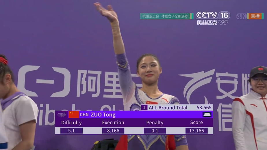原标题:左彤夺得杭州亚运会体操女子个人全能金牌