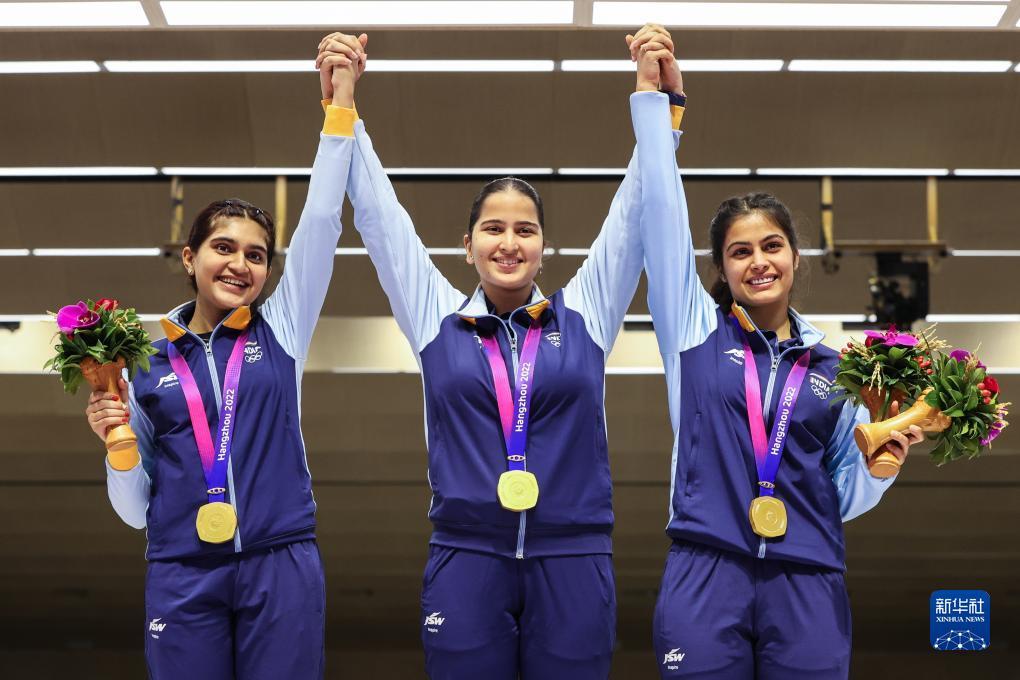 9月27日,获得金牌的印度队选手埃莎·辛格(左)、莱丝姆·桑格万(中)、玛努·巴克尔在颁奖仪式上。新华社记者 单宇琦 摄