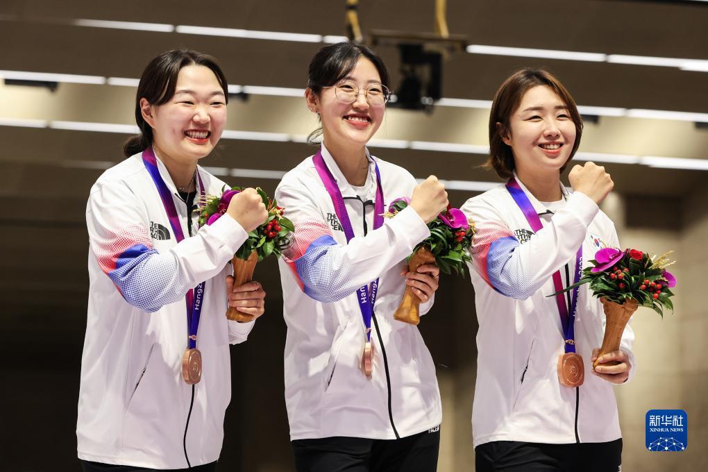 9月27日,获得铜牌的韩国队选手沈恩智(左)、梁智仁(中)、金烂妸在颁奖仪式上。新华社记者 单宇琦 摄