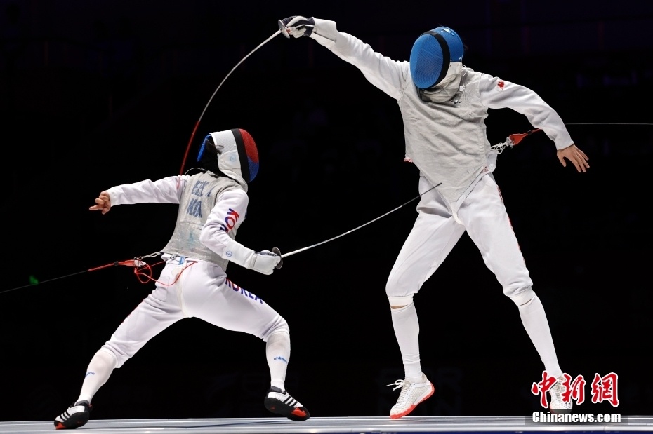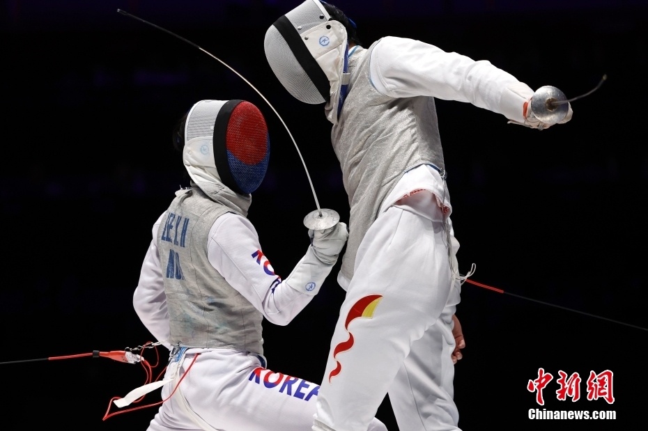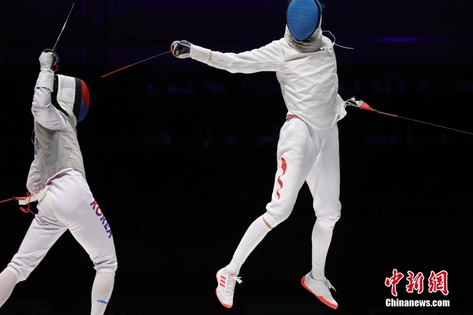 9月27日,第19届亚运会男子团体花剑决赛在杭州电子科技大学体育馆举行。中国队38比45负于韩国队,获得亚军。图为中国队选手许杰(右)在比赛中。