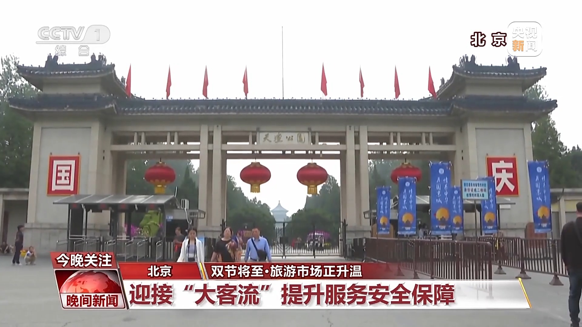 天坛公园管理处 管理科科长 任超:我们也是积极扩容服务措施。我们的售票窗口增加到了17条,各项通道扩大到最大程度的49条,采取一些比如说设置弯道、远端疏导等措施来保障游客的游览安全。