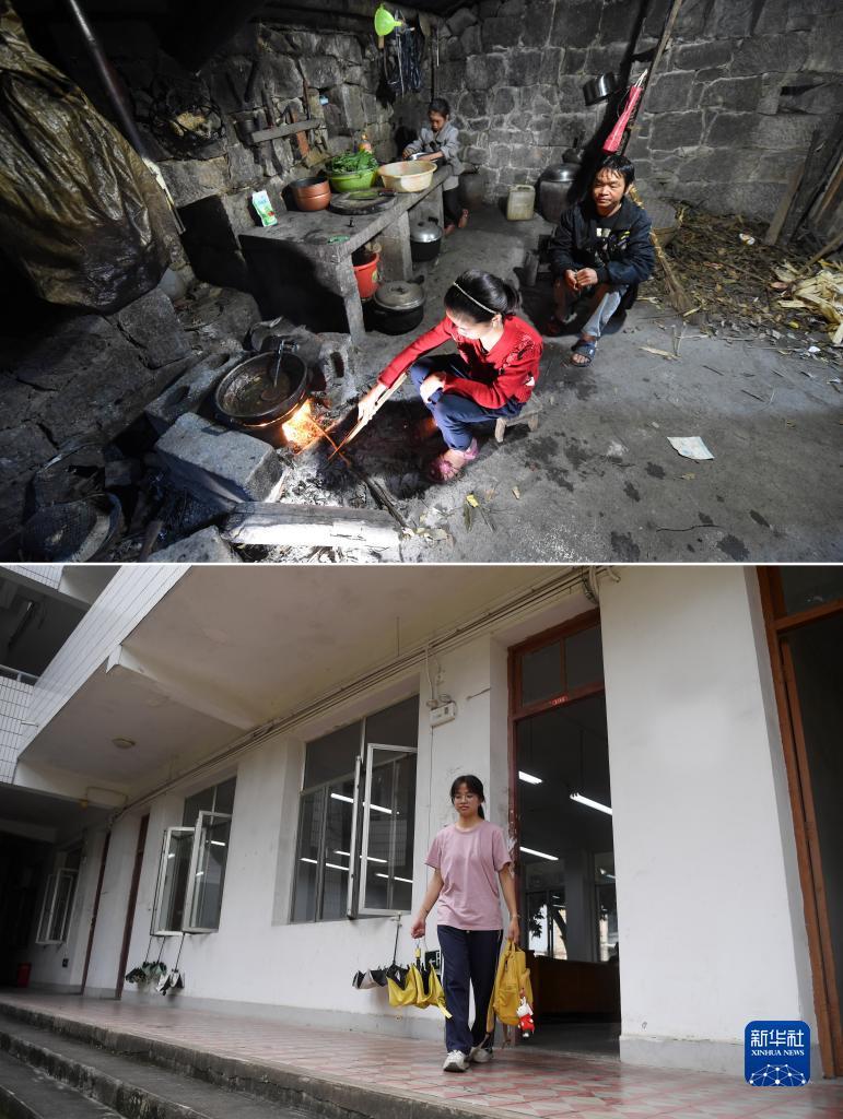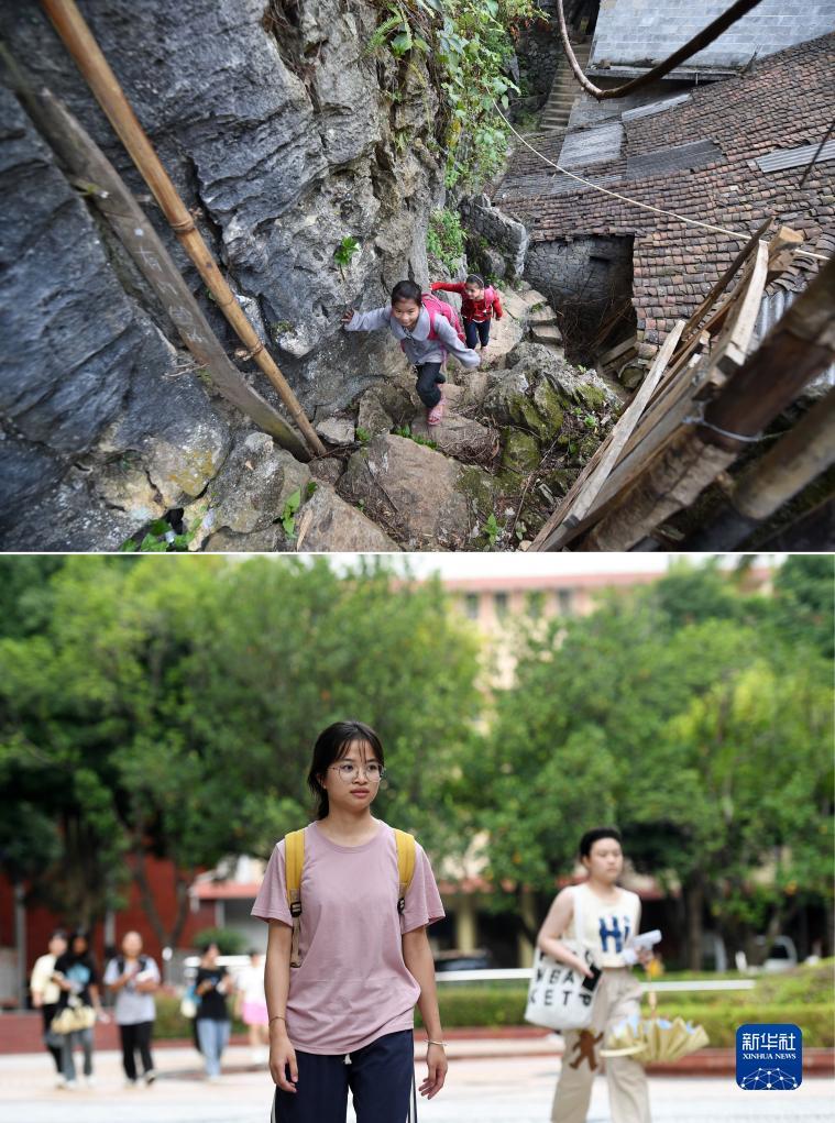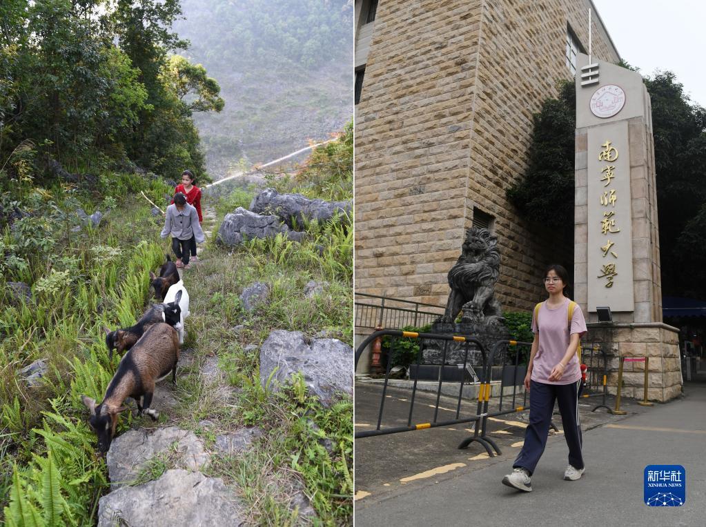 这是一张拼版照片,左图为:在广西都安瑶族自治县拉烈镇崇业村弄后屯,蓝晓萍(后)和妹妹蓝云萍放学回家后放羊(2015年4月14日摄);右图为:在广西南宁师范大学,蓝晓萍放学后走出校门(2023年9月26日摄)。