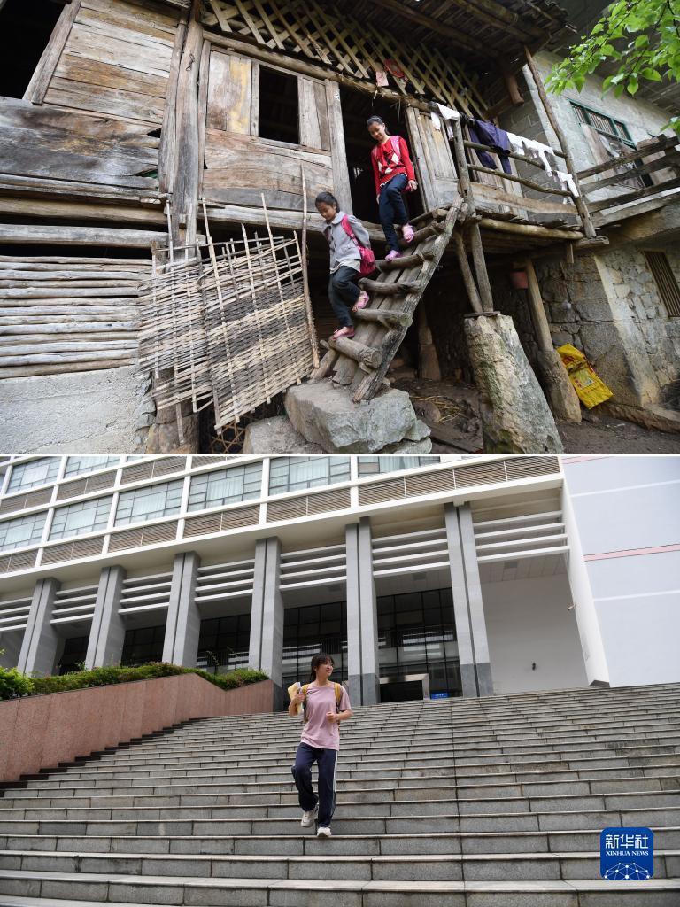 这是一张拼版照片,上图为:在广西都安瑶族自治县拉烈镇崇业村弄后屯,蓝晓萍(后)和妹妹蓝云萍走出家门去上学(2015年4月14日摄);下图为:在广西南宁师范大学,蓝晓萍走出学校图书馆(2023年9月26日摄)。