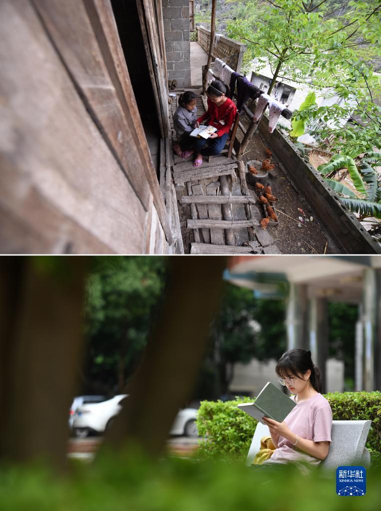 这是一张拼版照片,上图为:在广西都安瑶族自治县拉烈镇崇业村弄后屯,蓝晓萍(右)和妹妹蓝云萍坐在家门口看书(2015年4月14日摄);下图为:在广西南宁师范大学,蓝晓萍在校园里看书(2023年9月26日摄)。