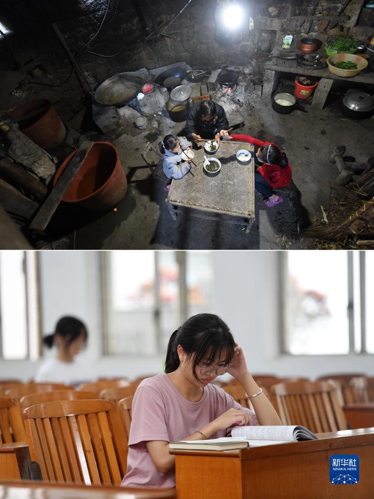 这是一张拼版照片,上图为:在广西都安瑶族自治县拉烈镇崇业村弄后屯,蓝晓萍(右)和妹妹蓝云萍(左)、父亲蓝启站在吃早饭(2015年4月14日摄);下图为:在广西南宁师范大学,蓝晓萍在教室里学习(2023年9月26日摄)。
