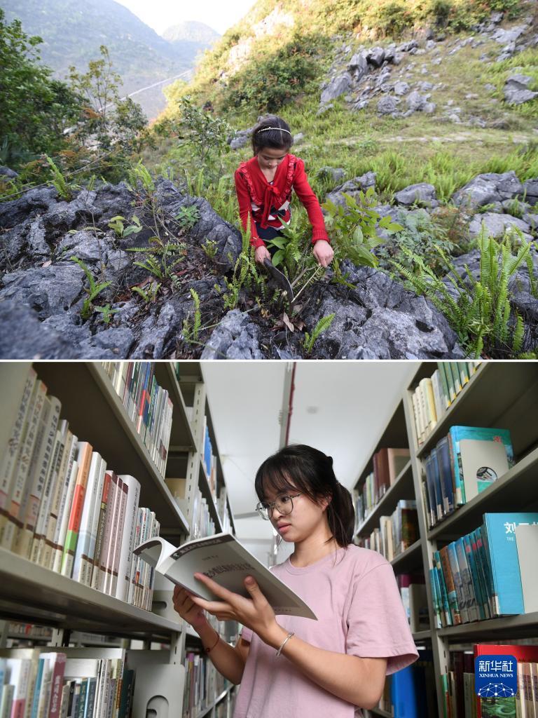这是一张拼版照片,上图为:在广西都安瑶族自治县拉烈镇崇业村弄后屯,蓝晓萍放学回家后在山上一边放羊一边砍柴(2015年4月14日摄);下图为:在广西南宁师范大学,蓝晓萍在图书馆里看书(2023年9月26日摄)。