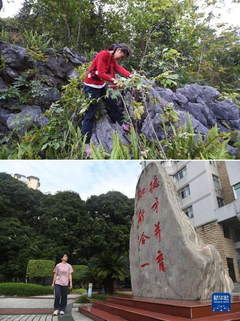 这是一张拼版照片,上图为:在广西都安瑶族自治县拉烈镇崇业村弄后屯,蓝晓萍放学回家后在山上一边放羊一边砍柴(2015年4月14日摄);下图为:在广西南宁师范大学,蓝晓萍走在校园里(2023年9月26日摄)。
