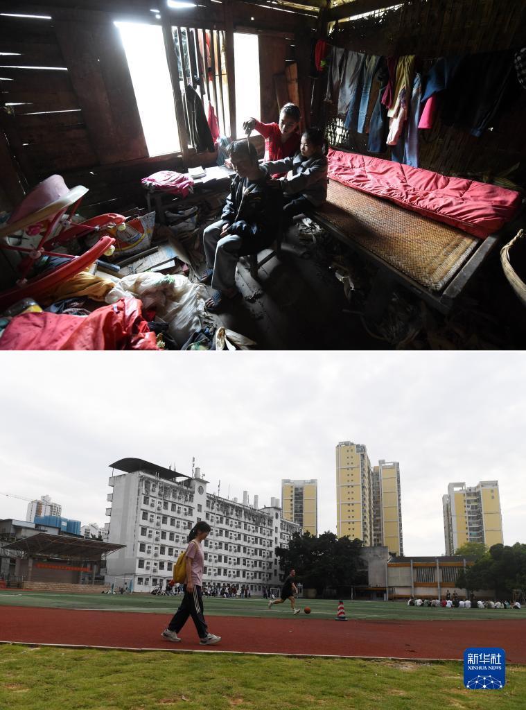 这是一张拼版照片,上图为:在广西都安瑶族自治县拉烈镇崇业村弄后屯,蓝晓萍(后)和妹妹蓝云萍走在上学的路上(2015年4月14日摄);下图为:在广西南宁师范大学,蓝晓萍走在校园里(2023年9月26日摄)。