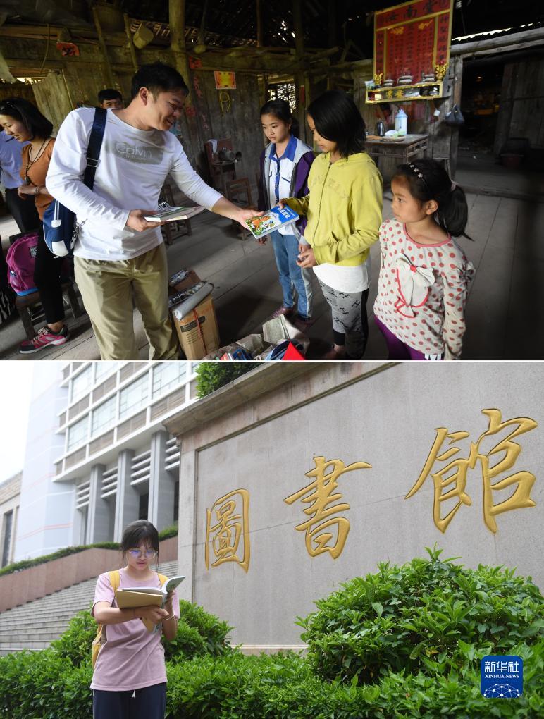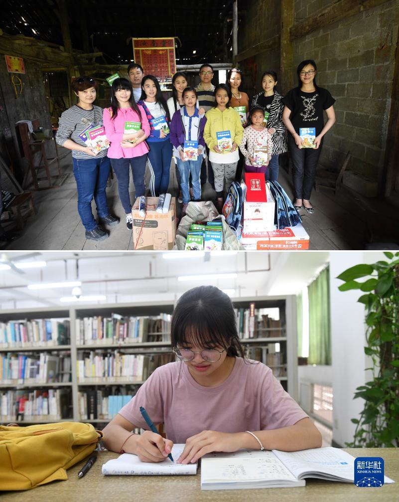 这是一张拼版照片,上图为:在广西都安瑶族自治县拉烈镇崇业村弄后屯,爱心人士给蓝晓萍(右三)姐妹捐赠书籍(2015年4月25日摄);下图为:在广西南宁师范大学,蓝晓萍走在图书馆前(2023年9月26日摄)。