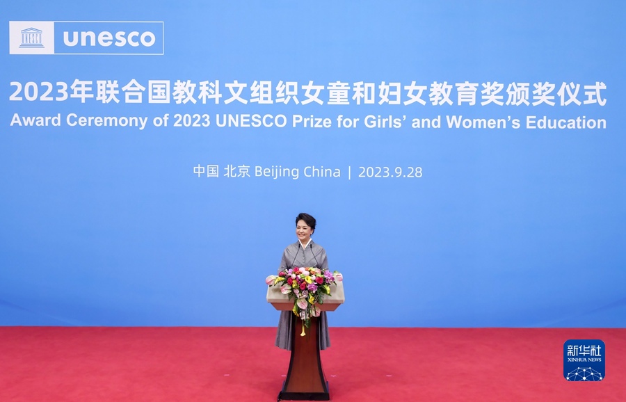新华社北京9月28日电 9月28日上午,国家主席习近平夫人、联合国教科文组织促进女童和妇女教育特使彭丽媛在北京同联合国教科文组织总干事阿祖莱共同出席2023年联合国教科文组织女童和妇女教育奖颁奖仪式并分别发表致辞。