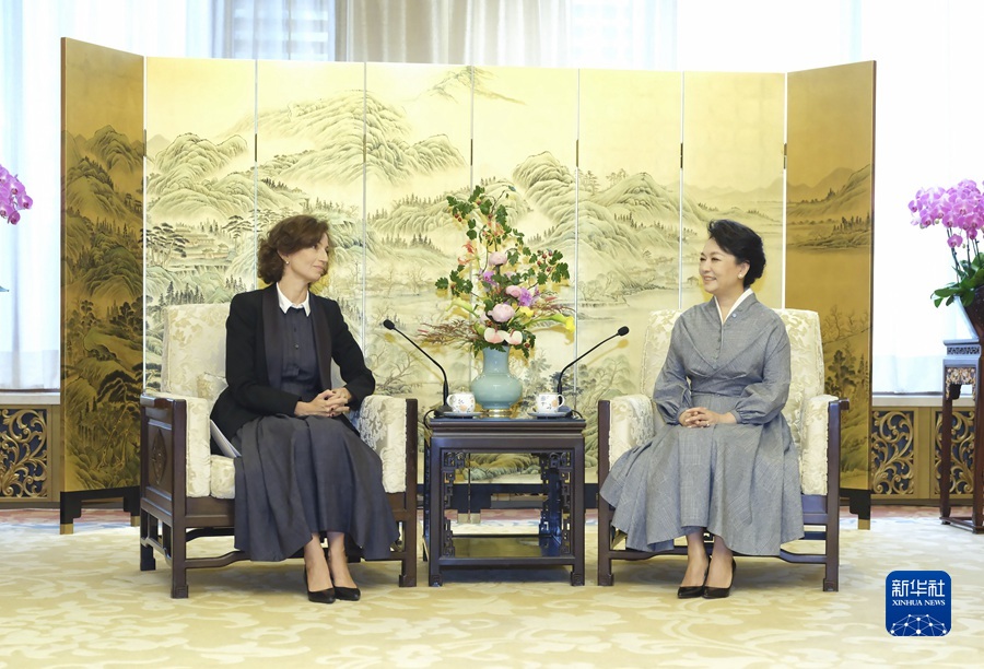 9月28日上午,国家主席习近平夫人、联合国教科文组织促进女童和妇女教育特使彭丽媛在北京同联合国教科文组织总干事阿祖莱共同出席2023年联合国教科文组织女童和妇女教育奖颁奖仪式并分别发表致辞。这是颁奖仪式前,彭丽媛会见阿祖莱。新华社记者 丁林 摄