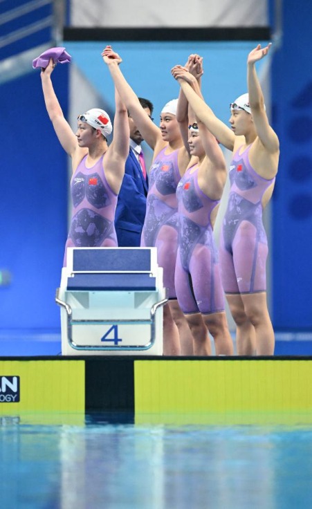 在男子4X100米自由泳接力决赛中,第一棒潘展乐在50米后就帮助中国队确立了领先位置,陈俊儿、洪金权和王浩宇此后继续扩大优势,最终中国队以3分10秒88的成绩率先触壁,夺冠的同时也打破了中国队在福冈世锦赛上创造的亚洲纪录。韩国队和日本队分获银牌和铜牌。