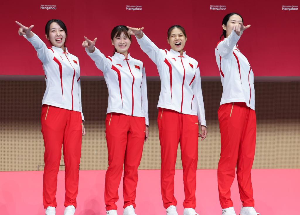 9月28日,冠军中国队在领奖台上。当日,在杭州亚运会女子花剑团体比赛中,中国队获得冠军。新华社记者 徐昱 摄