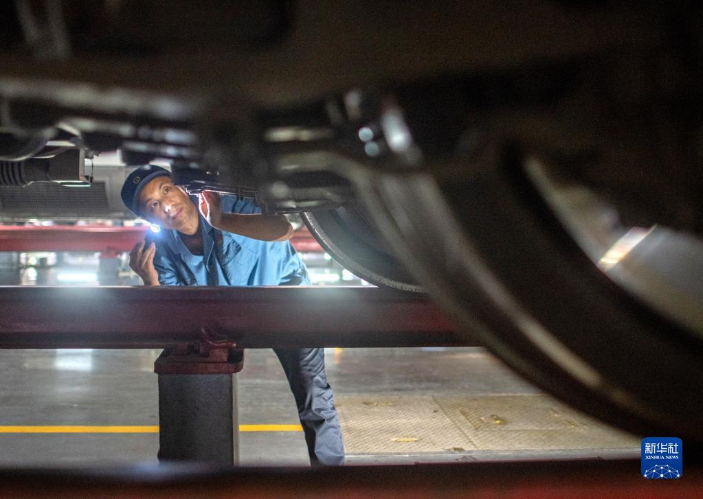 马耀锋在动车组车底巡检(9月26日摄)。新华社发(杜子璇摄)