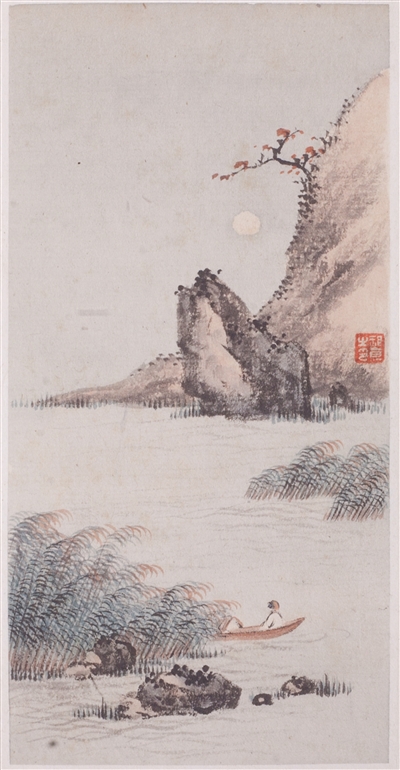 “洞庭秋月”是深受历代画家喜爱的画题,相传源于画家宋迪创作的8幅山水画“潇湘八景”。图为近代祁崑、沈枢合作的水墨设色山水画册中的一开,以“洞庭秋月”为主题,描绘了洞庭湖秋夜的月色。