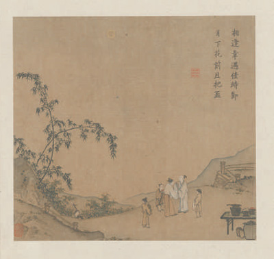 一些画作也描绘了中秋的美好时刻。南宋马远《月下把杯图》,勾勒了中秋亲友相聚的美好图景:满月当空,风来疏竹,乐声袅袅,美酒在杯,亲朋对饮。明代文徵明《中庭步月图》是表现文人月夜访谈的代表作,展现了画家与来客小醉后于秋天庭院中赏月话旧的雅会,寂静而明亮的月光,携无限情思,于画面之上浮现。