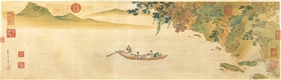 明代仇英《赤壁图》,描绘苏轼携友泛舟赏月、夜游赤壁之景。