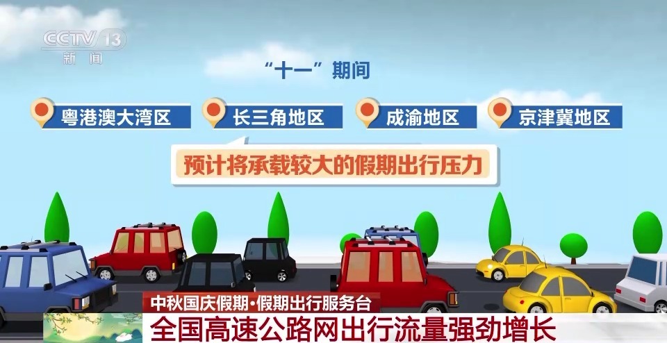 交通大数据平台的假期出行研判报告提示:“十一”期间粤港澳大湾区、长三角地区、成渝地区和京津冀地区预计将承载较大的假期出行压力。其中,G4京港澳高速芙蓉立交一五点梅立交段、G1522常台高速董浜南枢纽一董浜枢纽段、G4202成都绕城高速接待寺立交桥一府河大桥段、G6京藏高速公路邓庄桥一八达岭隧道段等为各地区假日期间易发生拥堵路段,提醒大家在自驾出行前提前规划线路。