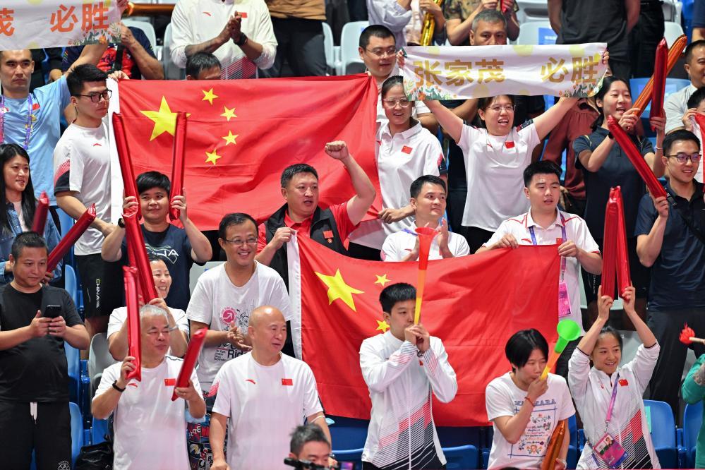 9月28日,观众为杭州亚运会拳击项目参赛选手加油。新华社记者 詹彦 摄