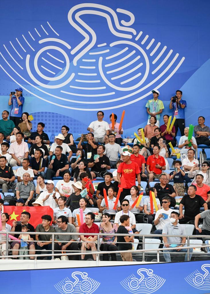 9月26日,观众在杭州亚运会场地自行车男子团体竞速赛场边观赛。新华社记者 胡虎虎 摄