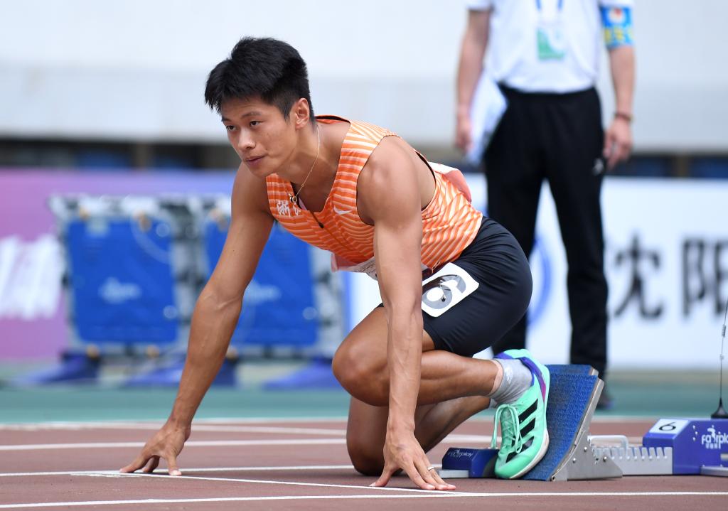 6月29日,浙江队选手谢震业在比赛前准备。最终,他以20秒49的成绩获得冠军。当日,2023年全国田径冠军赛暨世锦赛及亚运会选拔赛男子200米决赛在辽宁省沈阳市举行。新华社记者 龙雷 摄