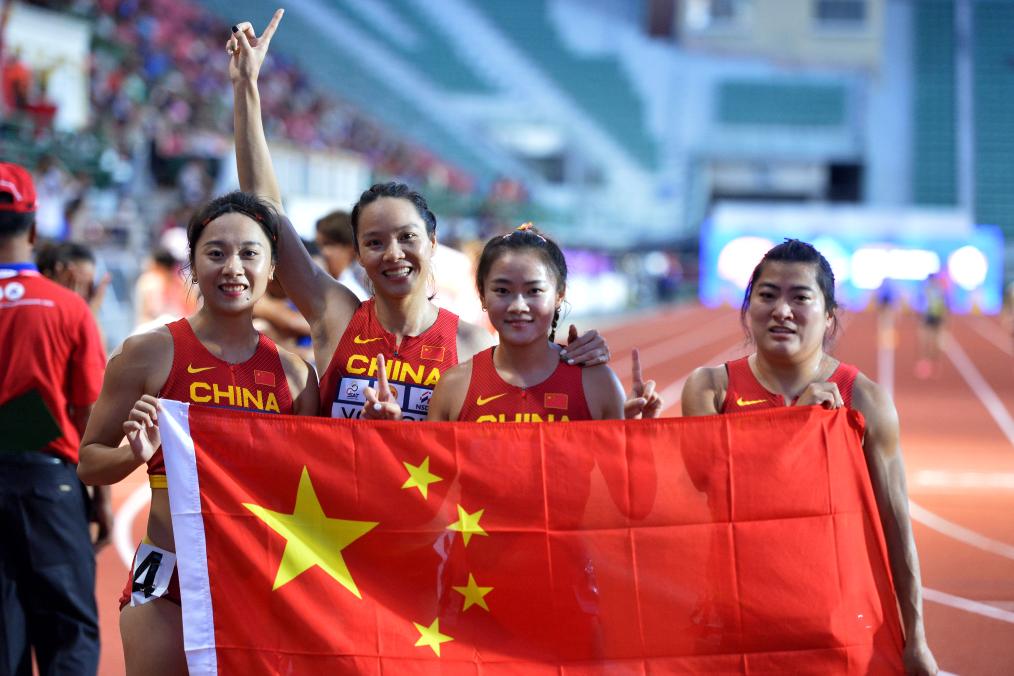 7月12日,中国队选手葛曼棋、韦永丽、梁小静和袁琦琦(从左至右)在女子4X100米接力决赛后合影。中国队以43秒35的成绩获得冠军。当日,2023年亚洲田径锦标赛在泰国曼谷举行。新华社发(拉亨摄)