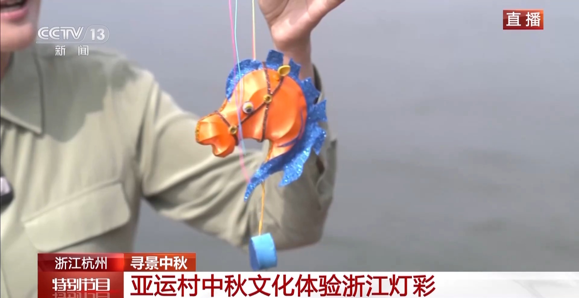 总台记者 李欣蔓:这个中秋与亚运碰到一起,这就是杭州的与众不同。本届亚运会是一场体育盛典,也是一次文化交流的盛会。今天晚上,将有浙江的灯彩的非遗交流互动。给大家看看,我手里的这个马头是来自浙江桐庐的“深奥灯彩”,因为今年马术比赛在桐庐举行,所以非遗传承人特别制作了这个马头造型的灯彩送给各国友人,也有着“马到成功”的美好寓意。