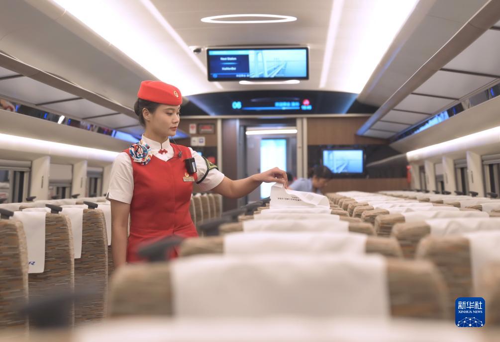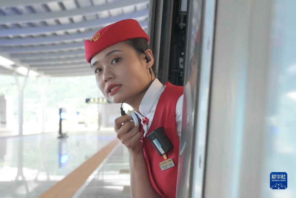 首发车G9801次列车长车艳雪和她的同事登上福厦高铁复兴号智能动车组为乘客服务。“在列车上我们要用心用情做好服务,让乘坐福厦高铁的乘客在旅行中享受到不一样的跨海之旅,展现我们海上‘高姐’的风采。”车艳雪说。