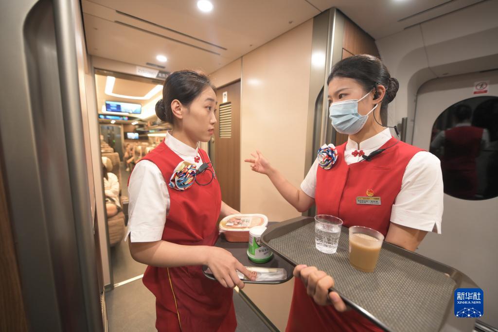 9月28日,列车员赵怡君(右)和餐服员郑智丽为商务座旅客提供餐食和饮品服务。新华社记者 林善传 摄