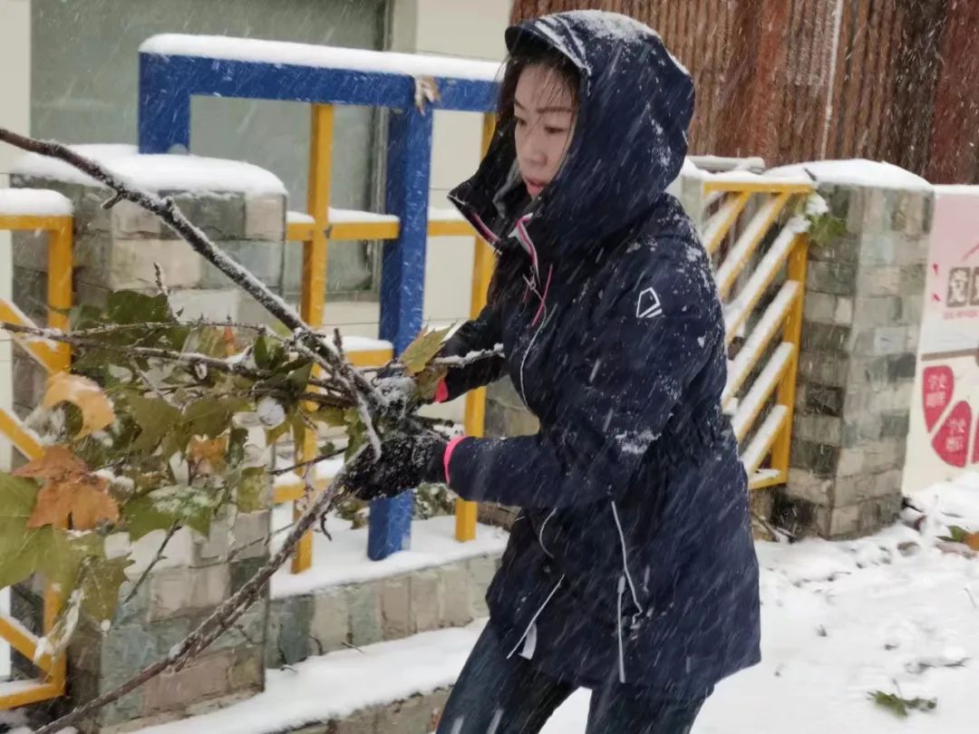 2021年11月,谭欣在社区清理路上因积雪造成断裂的树枝。