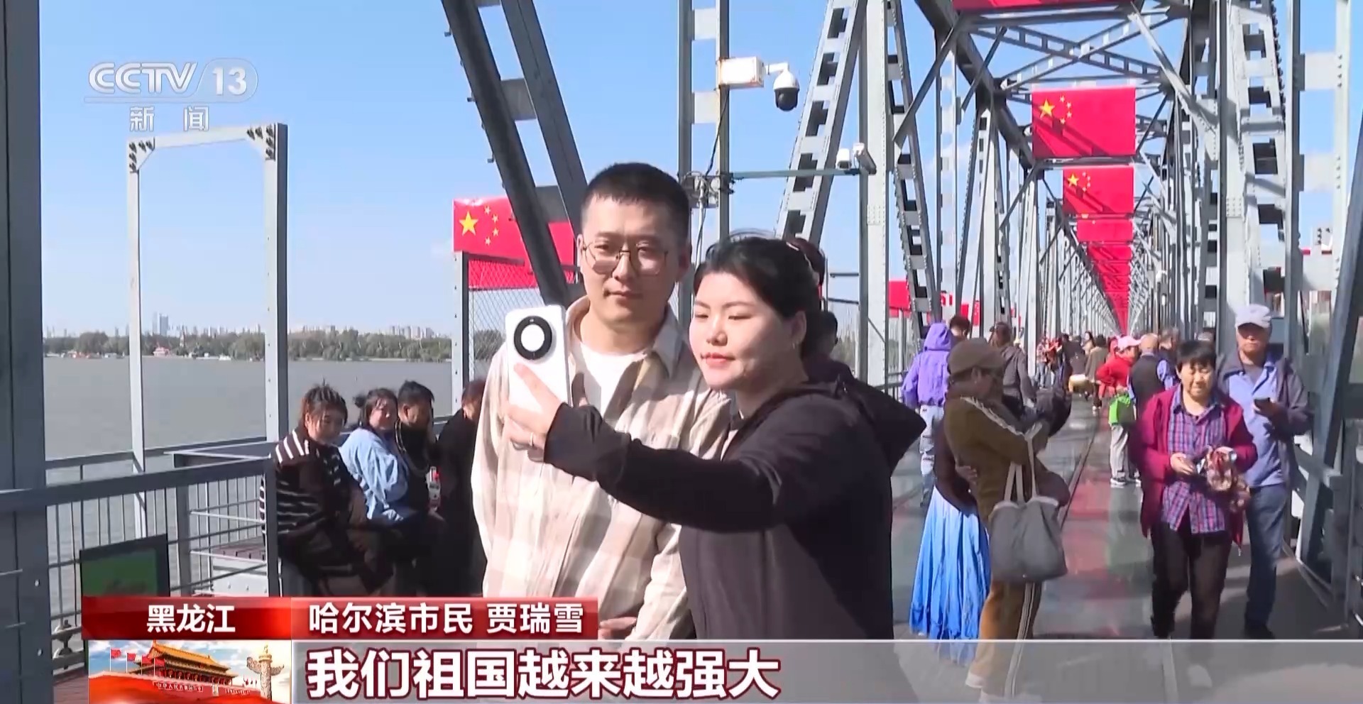 哈尔滨市民 贾瑞雪:来到“老江桥”跟国旗合个影。我们祖国越来越强大,生活越来越舒心了。然后看完这些国旗,我们内心真是觉得作为一个中国人而感到骄傲。