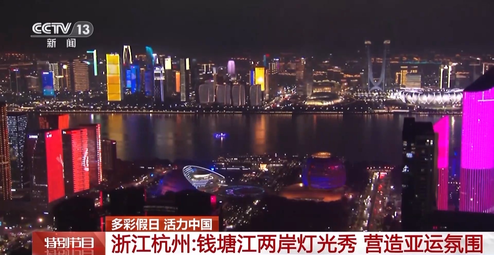 国庆假期,浙江杭州钱塘江两岸的灯光秀制作了特别的“亚运版”。南北两岸城市建筑群都成为灯光秀的景观,全长达到18.5公里。79幢楼宇,将城市的夜空点亮,流光溢彩,呈现了一场绝美灯光秀大片,让市民游客共同感受浓厚的亚运氛围。杭州奥体中心体育场“大莲花”在灯光的映衬下显得格外璀璨。成片的光柱在夜空中舞动,它们时而绚烂多姿,时而直冲云霄,让现场的观众发出一阵阵惊呼。