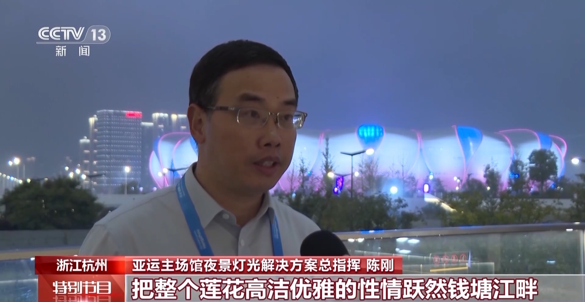 亚运主场馆夜景灯光解决方案总指挥 陈刚:借鉴了江南烟雨的特色,把整个莲花高洁优雅的性情跃然钱塘江畔,展现我们中国的气质和形象。