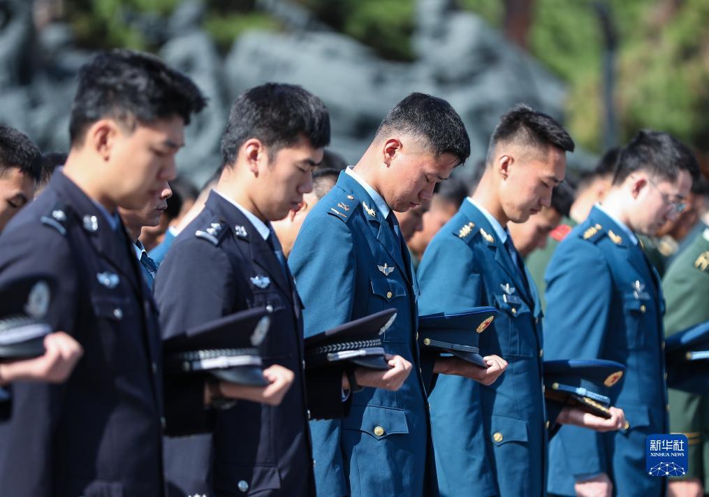 9月30日,人们在辽宁省暨沈阳市向烈士敬献花篮仪式中默哀。