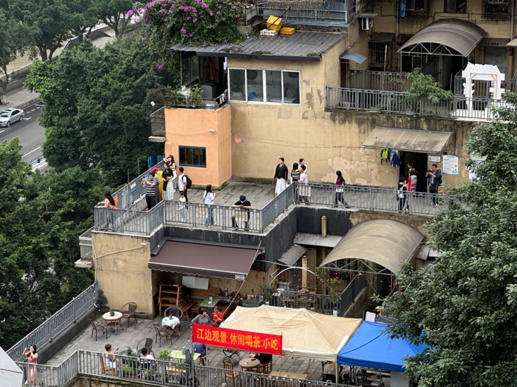 在重庆新晋“网红”景点白象居,只见许多游客前来打卡。来自西安的大四学生杜易航站在白象居观景天台上,不断变换角度给女友拍照。杜易航在社交媒体上了解到白象居,“完全不会觉得不方便,吃喝玩乐在这个居民楼里都能实现。”杜易航说。
